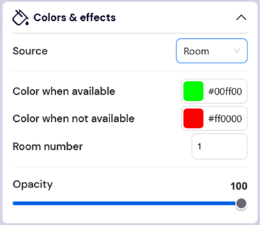 - Create a ‘Shape’ element and set the Source to ‘Room’. We can now set the colour of the shape based on whether the room is available or not. With this we can create a status on the room booking page to indicate availability. This is also tied to supported tablets with LED functionality.