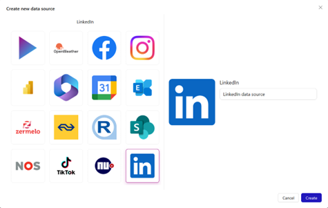 Choose LinkedIn, fill out a name and press the Create button to the right to create a new data source.